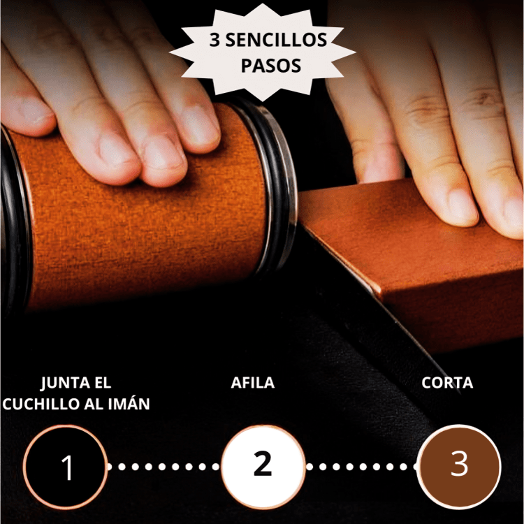 Nuestro afilador cilíndrico con base imantada mantiene el cuchillo fijo y permite afilar con precisión profesional, sin errores, sin complicaciones.